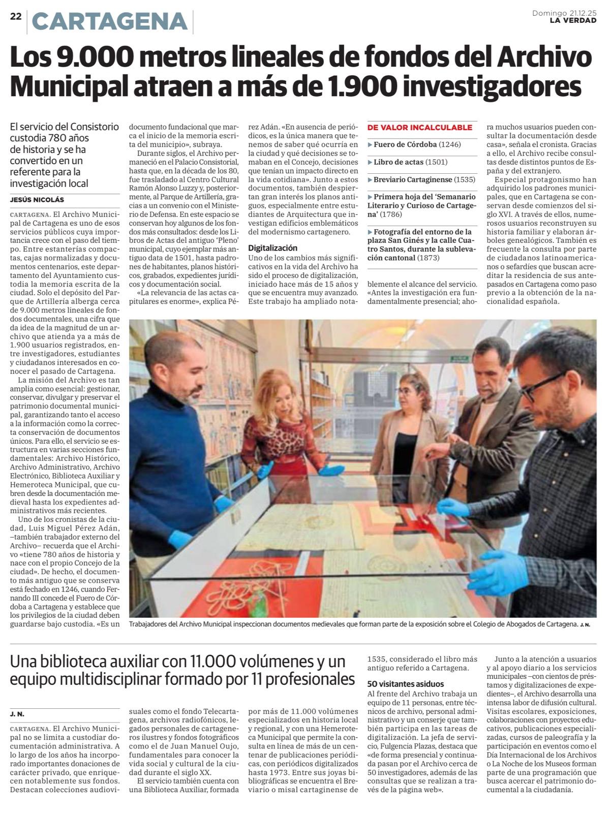 Reportaje sobre el Archivo Municipal de Cartagena en el diario 'La Verdad'