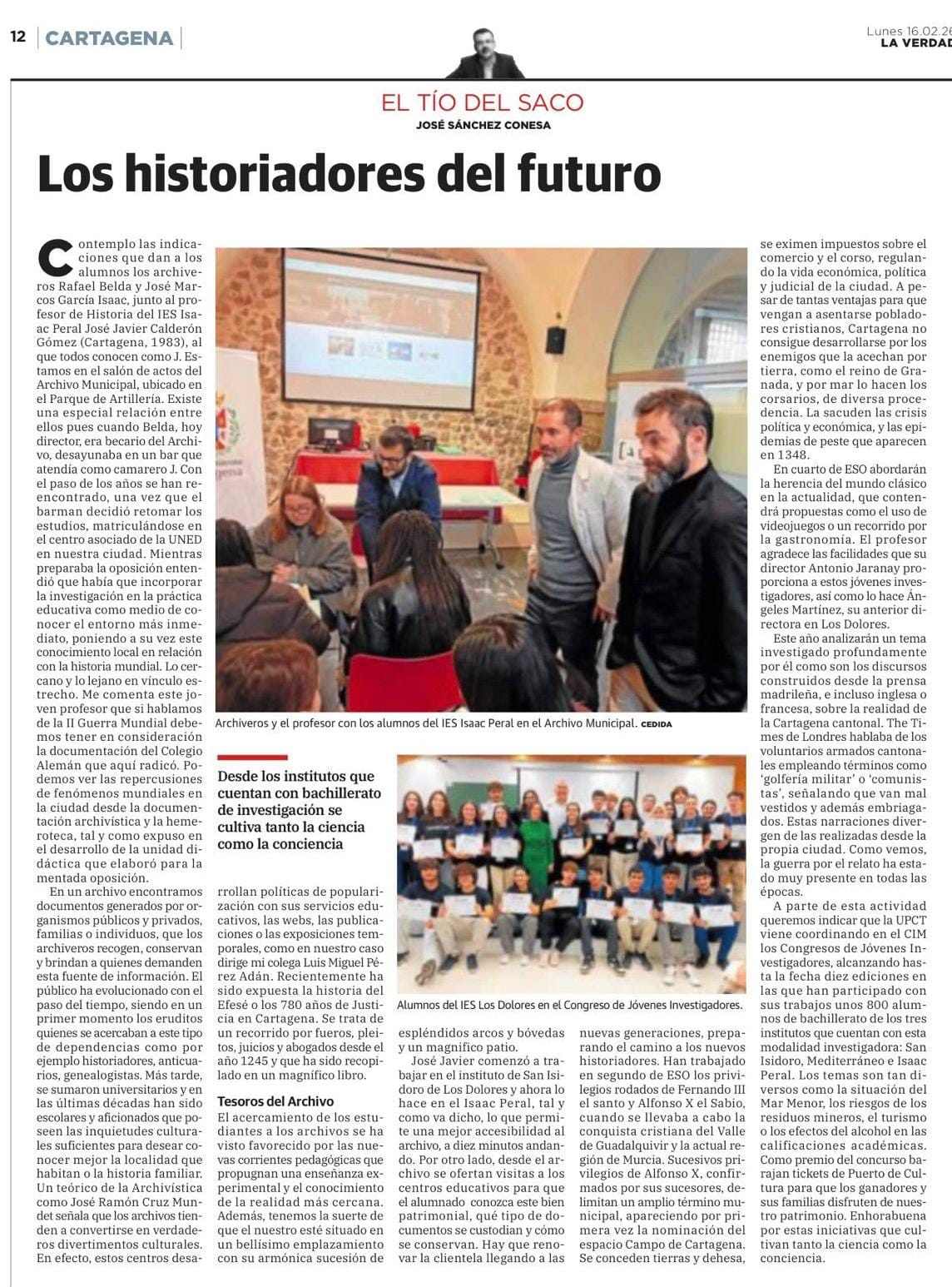 Hoy en el diario 'La Verdad' el cronista José Sánchez Conesa se hace eco del proyecto 'Jóvenes investigadores'. Una iniciativa de José Javier Calderón, profesor del IES Isaac Peral, que pretende iniciar a los más jóvenes en las tareas de investigación en el Archivo Municipal.